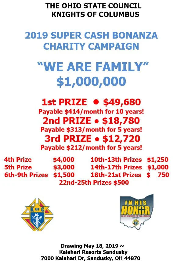 Super Cash Bonanza is the Ohio State Council’s annual Charity Campaign. The income from the Charity Campaign provides a significant amount of funding for our council’s many charitable donations that are given to our church, school systems and community projects. The campaign is funded through our ticket sales - so member knights are encouraged to help support their council by purchasing and selling their tickets.